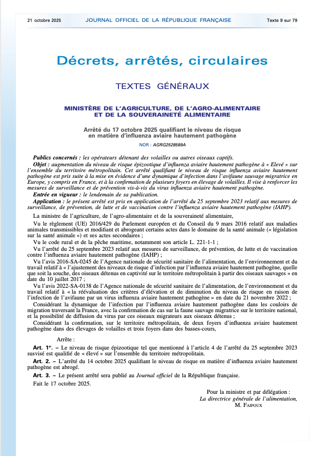 Le ministère de l’Agriculture a annoncé le passage du risque de grippe aviaire au niveau Élevé dans toute la France.